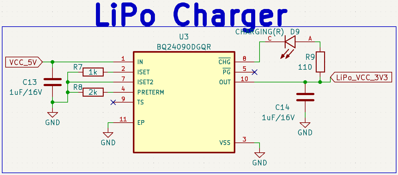To charge the one-cell LiPo battery that powers our logic circuit, we’ll need a LiPo charger circuit. I built this around the BQ24090DGQR IC, which I’ve used in previous projects. To learn more about why I placed everything the way I did, check out the part datasheet. I get most of my information from there.
