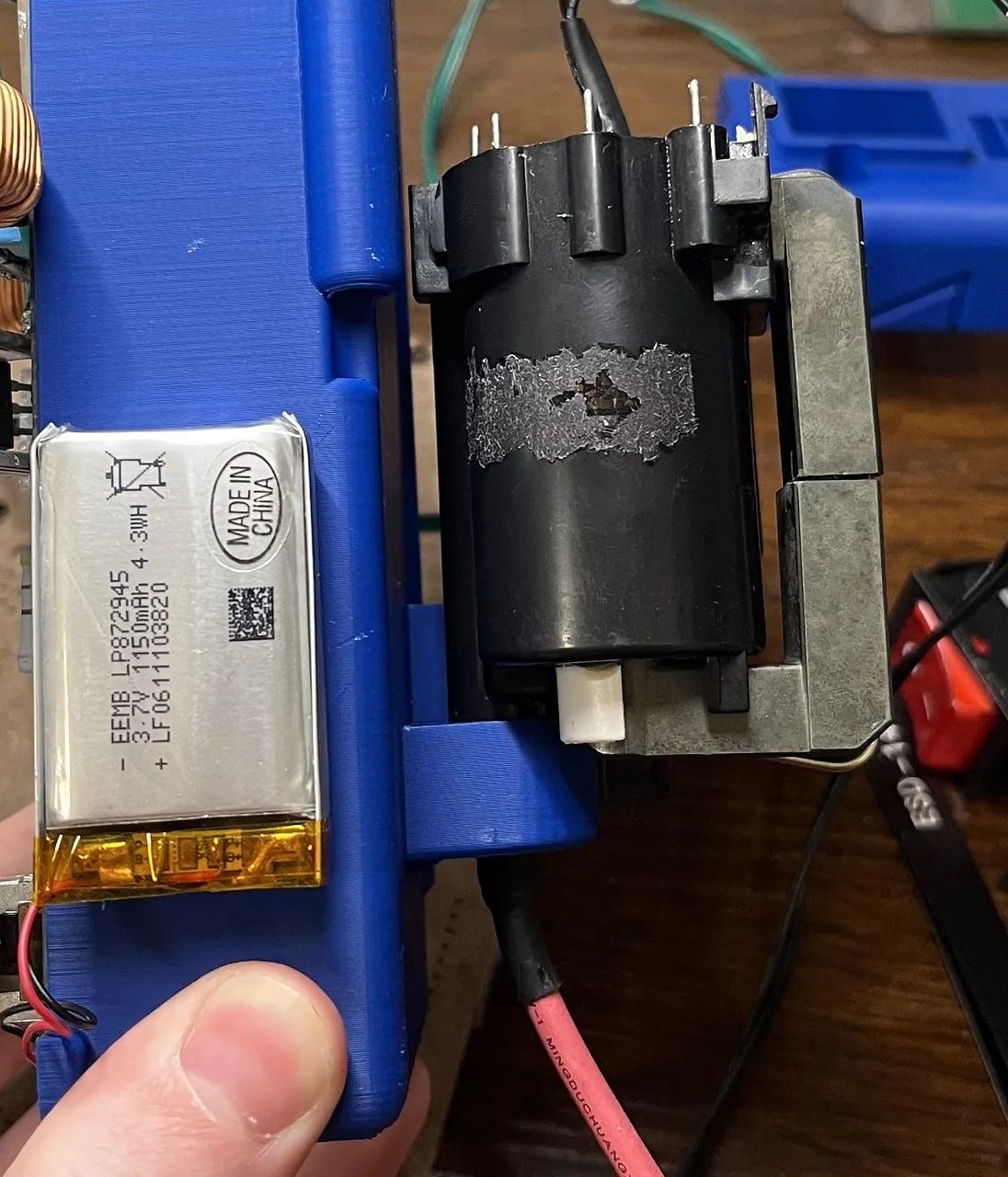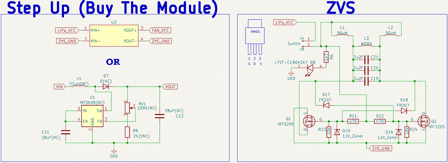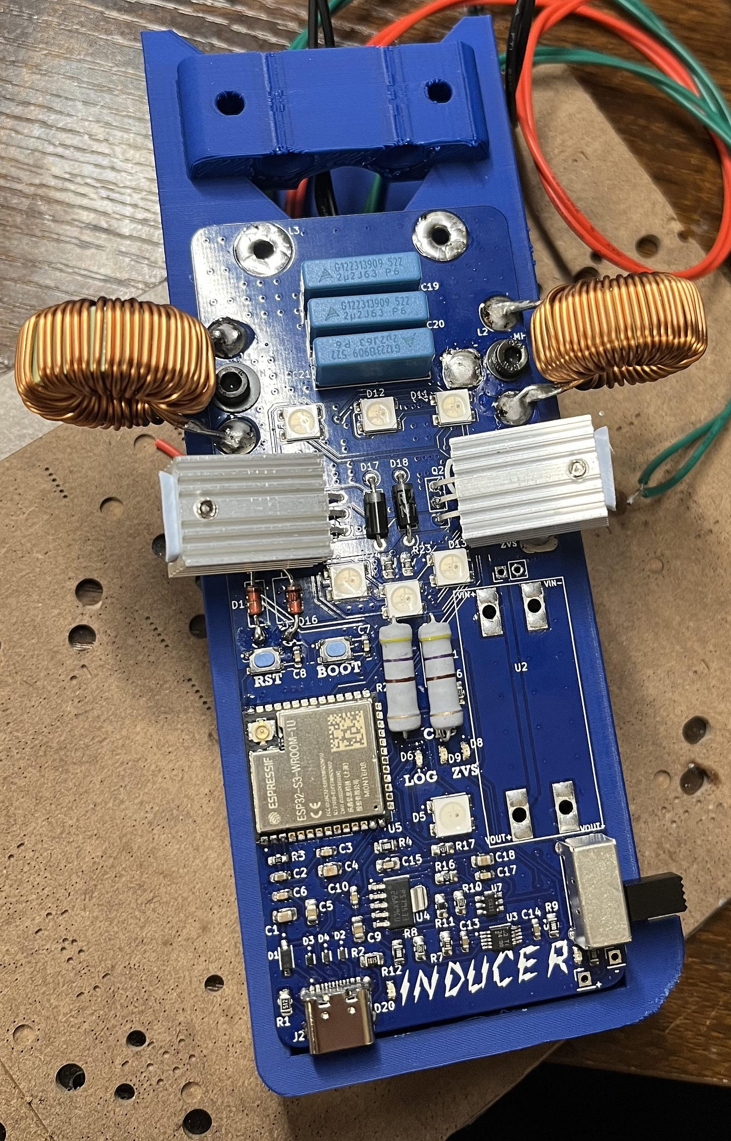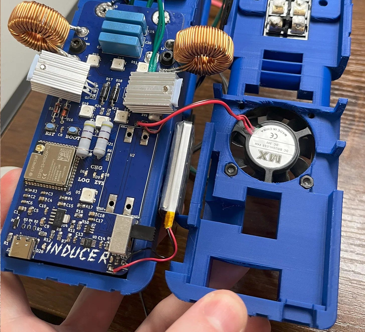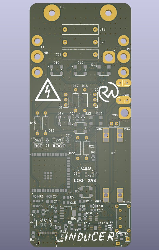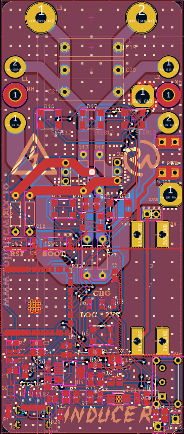 After days of experimentation, to make this circuit work I found it best to completely isolate the high and low power sections (the ZVS and RGB logic). I originally just wanted to have one built-in 3S charger for the main 3S LiPo, then use that to power the logic and RGB LEDs in addition to the ZVS circuit. Theoretically, this can be done as 12V isn’t that high. However, due to the unique nature of the high-power oscillator, I ran into problems (mostly involving me frying the ESP32-S3 again and again). I was able to make it work for a little while but it lacked consistency. By isolating the two, you lose the perk of being able to charge/monitor the main battery but it furthers the lifespan of the Inducer significantly. In the end, I believe this is a better trade-off.
