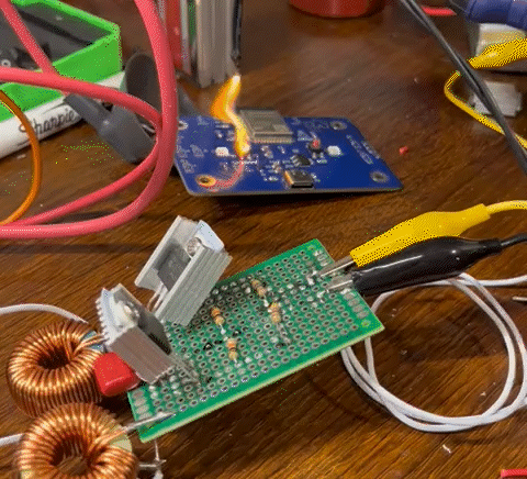 Here’s one of my first ZVS circuit prototypes in which I got a really cool arc to dance around on an old/broken circuit board from a previous project.