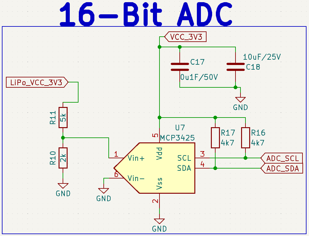 To monitor the one-cell LiPo we are using to power our logic, I chose a 16-bit resolution ADC (Analog to Digital Converter) chip. (If you’re interested, I talked about ADCs in this project.) Even though the ESP32-S3 has a built-in ADC, it only has a 12-bit resolution, meaning it can only represent a possible 4095 different values while our new 16-bit one can represent a possible 65535 different values. That’s 16 times the resolution of our ESP32-S3! This is especially useful because we are only reading a small range of voltage values to determine the charge in the battery, meaning we need a high resolution to be able to read that range accurately.