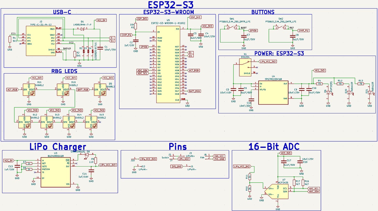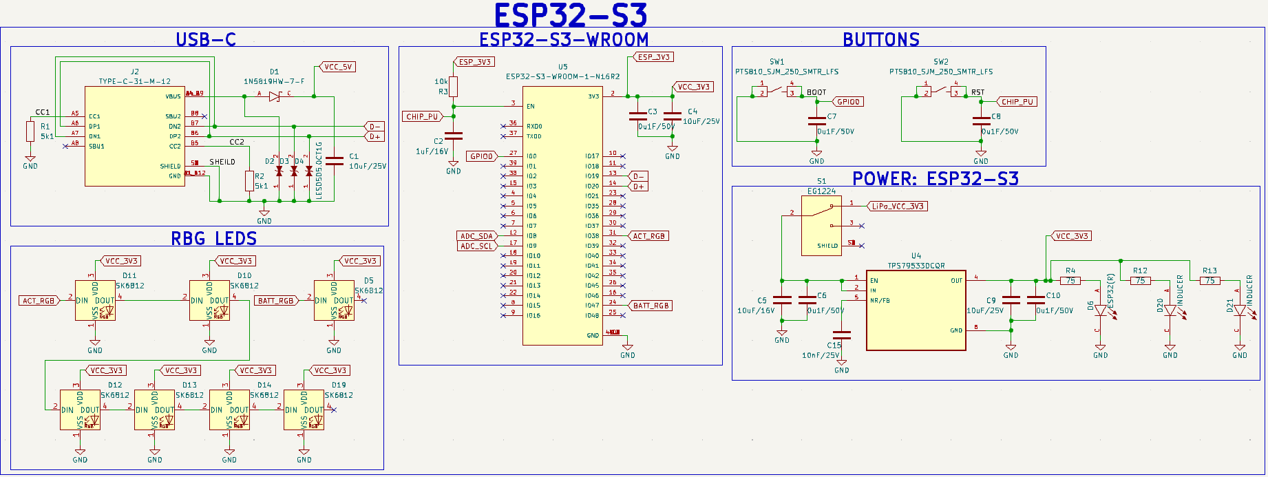 Now, let’s get to it. Everything in the ESP32-S3 box is for our ESP32-S3 microcontroller. Basically, we just have some buttons for resetting the controller if we need to, a low-dropout-voltage regulator to bring the voltage down to 3V3 from 3V7 (from the one-call LiPo), a USB-C port, and our RGB LEDs. If you want to learn more, check out this page which has all of the datasheets for the ESP32-S3.