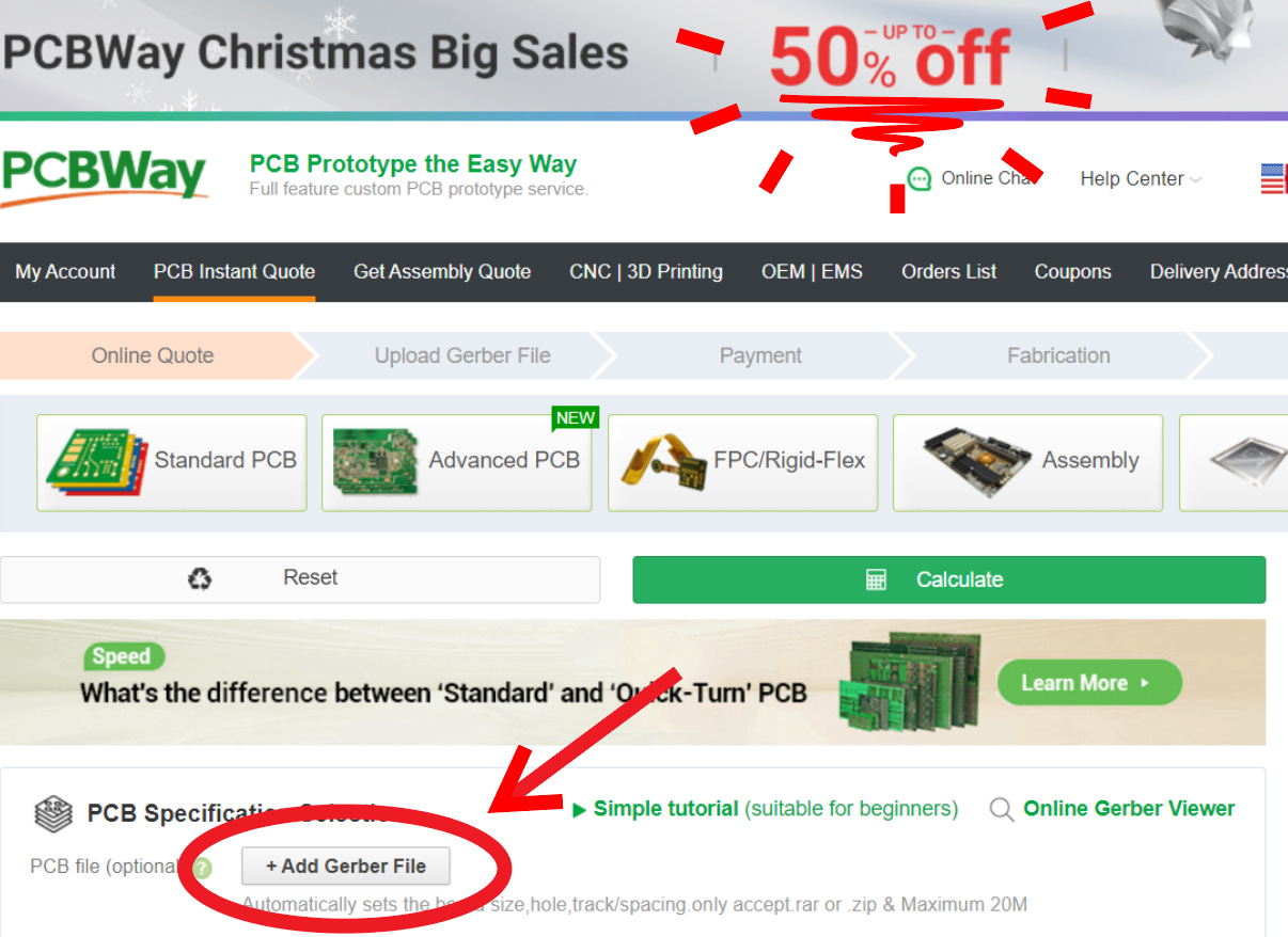 However, you can always just order through their website by going to PCBWay.com, clicking on quick-order PCB, and uploading the Gerber/Fab file for the board. Or alternatively, just go here which I have saved in my favorites bar. I recommend clicking the stencil option at checkout to save some headaches!