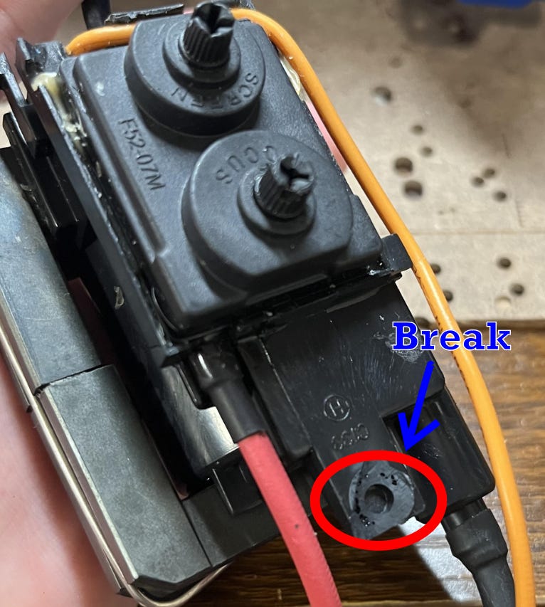 After that, grab your handle piece and thread your two switch wires through it. Once they’re through, you can solder them to the 30A switch. Definitely use some heat shrink on those exposed wires! Remember, the switch terminals must be connected vertically like in the picture.