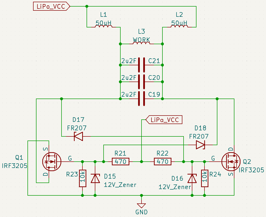The other component you may not be super familiar with is the Zener diodes I have placed across the gate of the MOSFETs. All you really need to know about them for now is that they break down voltages above their rating (12V) so that there is never more than 12V supplied to the gate which could damage the FET. This isn’t super necessary since the LiPo only supplies 12V, however, sometimes in oscillator circuits a higher voltage can become present and they’re there just as a precaution in case it does. For example, I’ve noticed voltages spikes up to 30V upon power up. (This could be fixed using a soft start circuit but that’s for another time.)